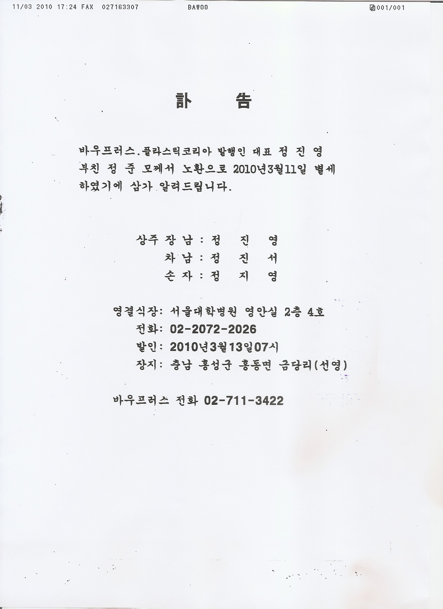 2. 본 조합 특별회원사 이신 바우프러스(플라스틱코리아) 정진영 사장님의 부친께서 별첨과 같이 별세하셨음을 訃告하여 주셨기에 삼가 고인의 면복을 빌며 안내합니다.
