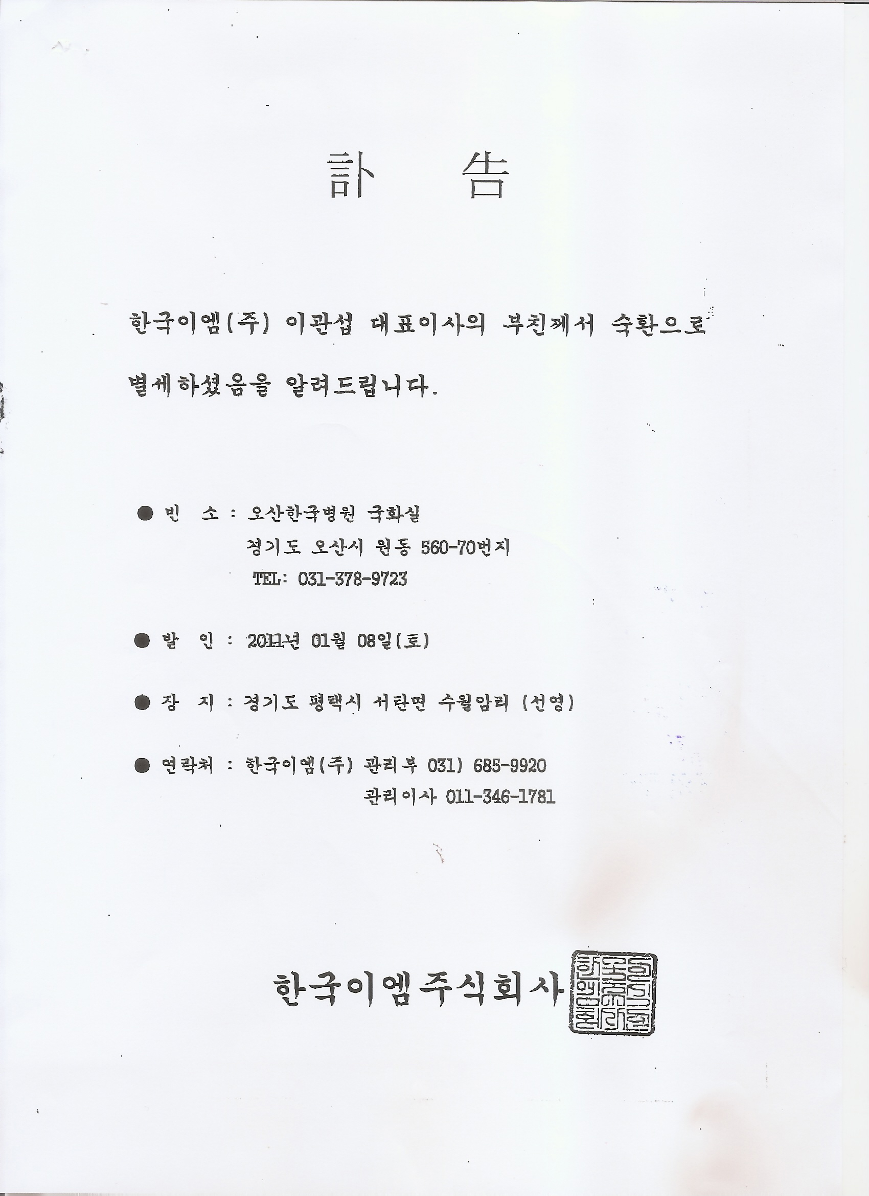 - 본 조합 압출기계분과에 회원사이신 한국이엠(주) 이관섭 사장님의 부친께서 별첨과 같이 별세하셨음을 訃告하여 주셨기에 삼가 고인의 명복을 빌며 안내합니다.
