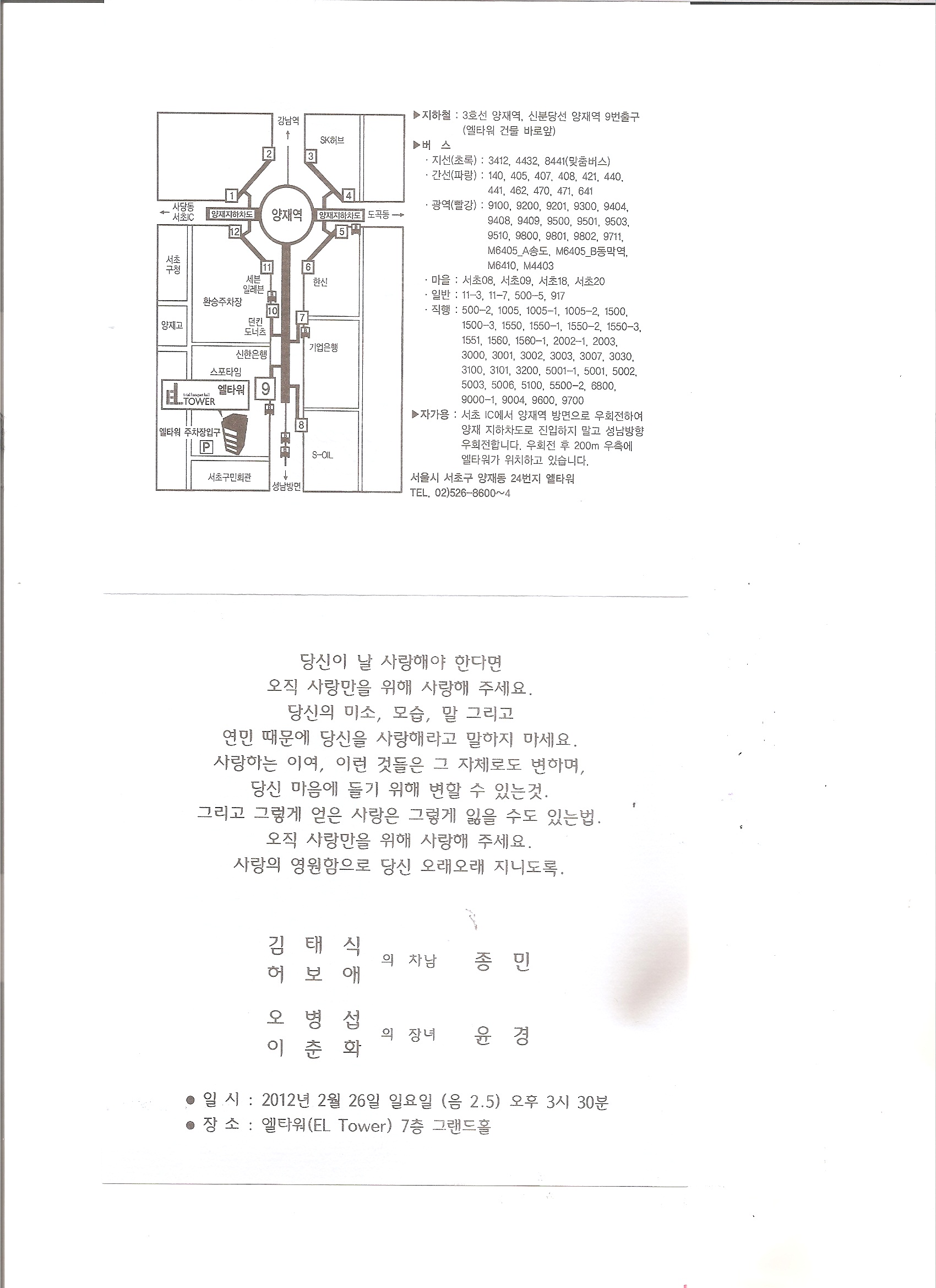 - 본 조합 주변기기분과에 이사사이시며, 회원사이신 현대전기기계공업(주) 대표이사님의 장녀 오윤경 양과 김종민 군이 2월 26일(일) 오후3시 30분에 엘타워 7층 그랜드홀에서 결혼식이 거행됨을 안내 합니다.