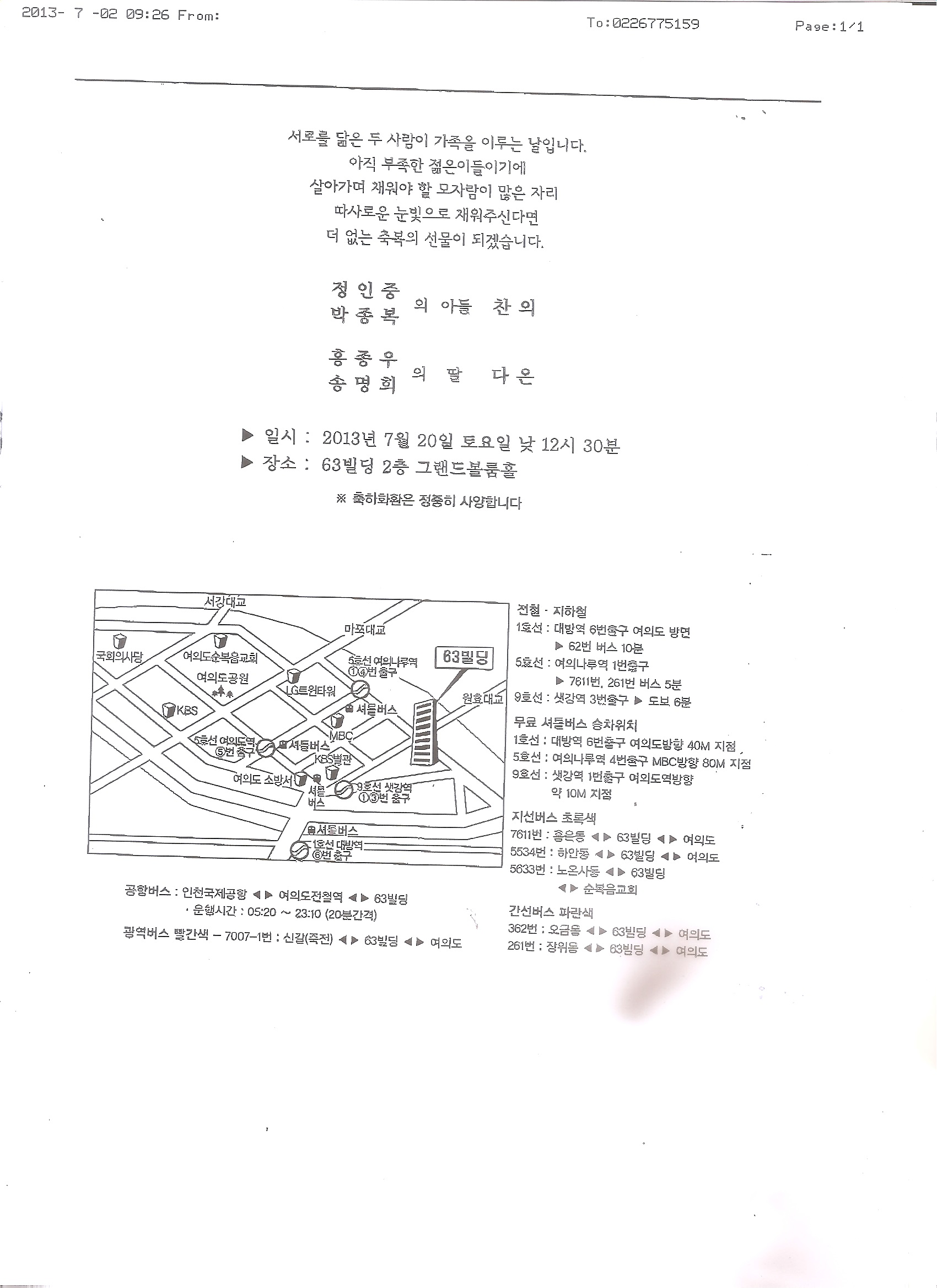 - 본 조합 압출기기분과에 회원사이신 ㈜동방이엔지 대표이사님의 아들 정찬의 군과 홍다은 양이 7월 20일(토) 낮12시 30분에 63빌딩 2층 그랜드볼룸홀에서 결혼식이 거행됨을 안내 합니다.