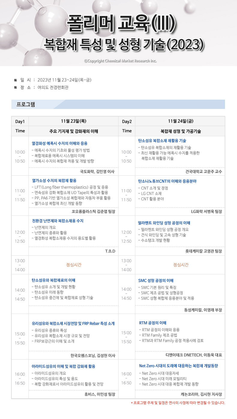 폴리머교육(Ⅲ)-복합재 특성 및 성형기술 개최! [11/23-24] | |