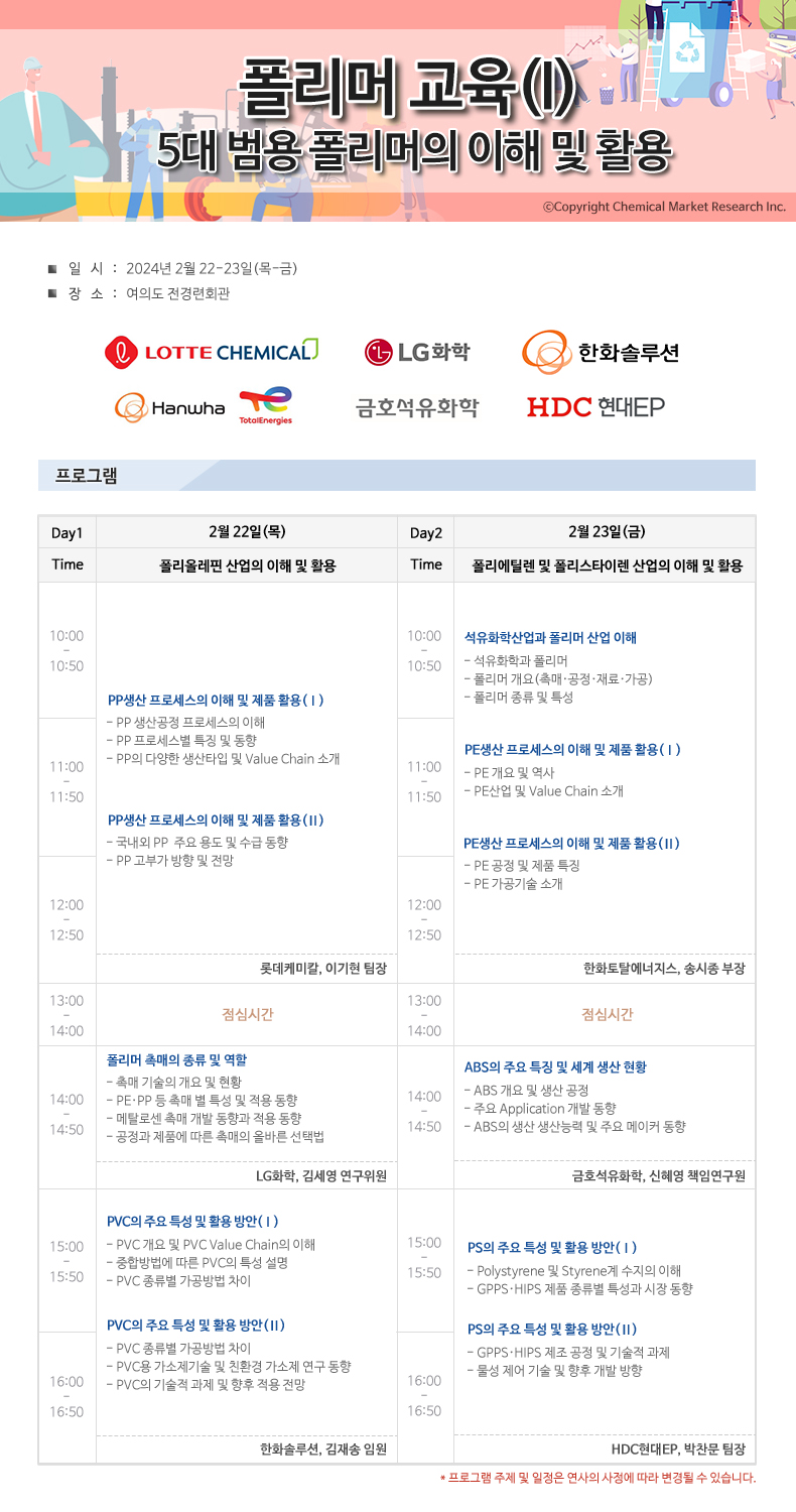 다가오는 2024년 2월 22-23일 양일간 폴리머교육(Ⅰ)-5대 범용 폴리머의 이해 및 활용을 개최합니다.