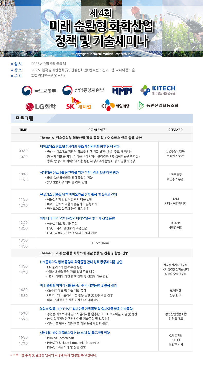 다가오는 2025년 9월 5일 제 4회 미래 순환형 화학산업 정책 및 기술세미나를 개최합니다.