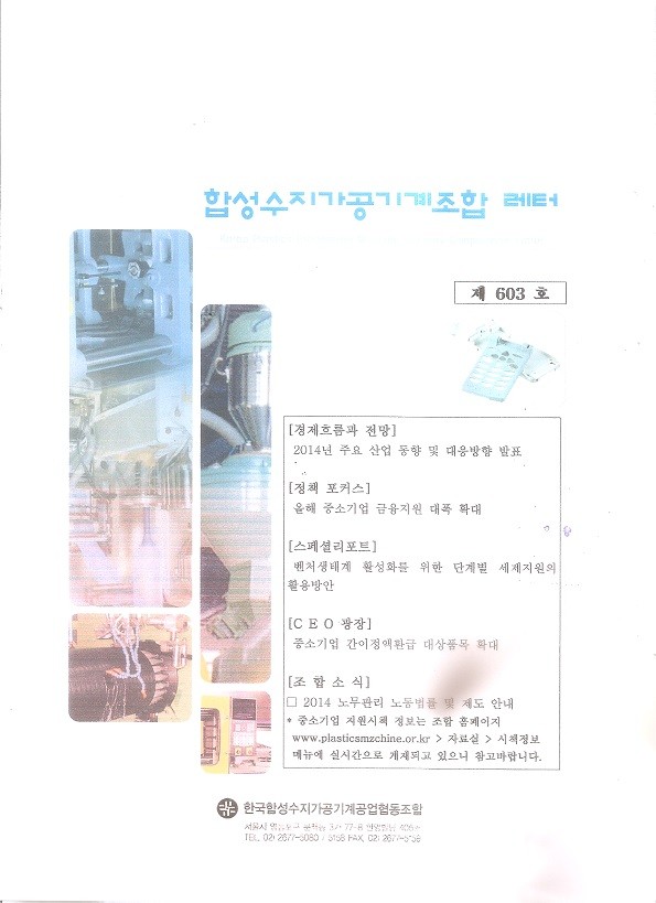 [경제흐름과 전망] 2014년 주요 산업 동향 및 대응방향 발표 [정책 포커스] 올해 중소기업 금융지원 대폭 확대 [스페셜리포트] 벤처생태계 활성화를 위한 단계별 세제지원의 활용방안 [C E O 광장] 중소기업 간이정액환급 대상품목 확대 [조 합 소 식] □ 2014 노무관리 노동법률 및 제도 안내 * 중소기업 지원시책 정보는 조합 홈페이지 www.plasticsmzchine.or.kr > 자료실 > 시책정보 메뉴에 실시간으로 게재되고 있으니 참고바랍니다.