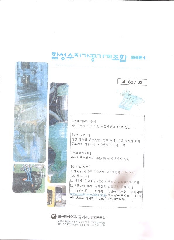 [경제흐름과 전망] 올 14분기 모든 산업 노동생산성 1.1% 상승 [정책 포커스] 시장 창출형 연구개발사업에 최대 10억 원까지 지원 중소기업 기술개발 전자평가 시스템 구축 [스페셜리포트] 통상정책추진위서 비관세장벽 대응체제 마련 [C E O 광장] 전자제품 기계류 수출기업 원산지검증 위험 높아 [조 합 소 식] □ 제5기 민·관합동 CEO 정책포럼 교육대상자 모집 □ 7월부터 전자세금계산서 발급의무 확대 안내 * 중소기업 지원시책 정보는 조합 홈페이지www.plasticsmachine.or.kr>자료실>시책정보 메뉴에 실시간으로 게재되고 있으니 참고바랍니다.
