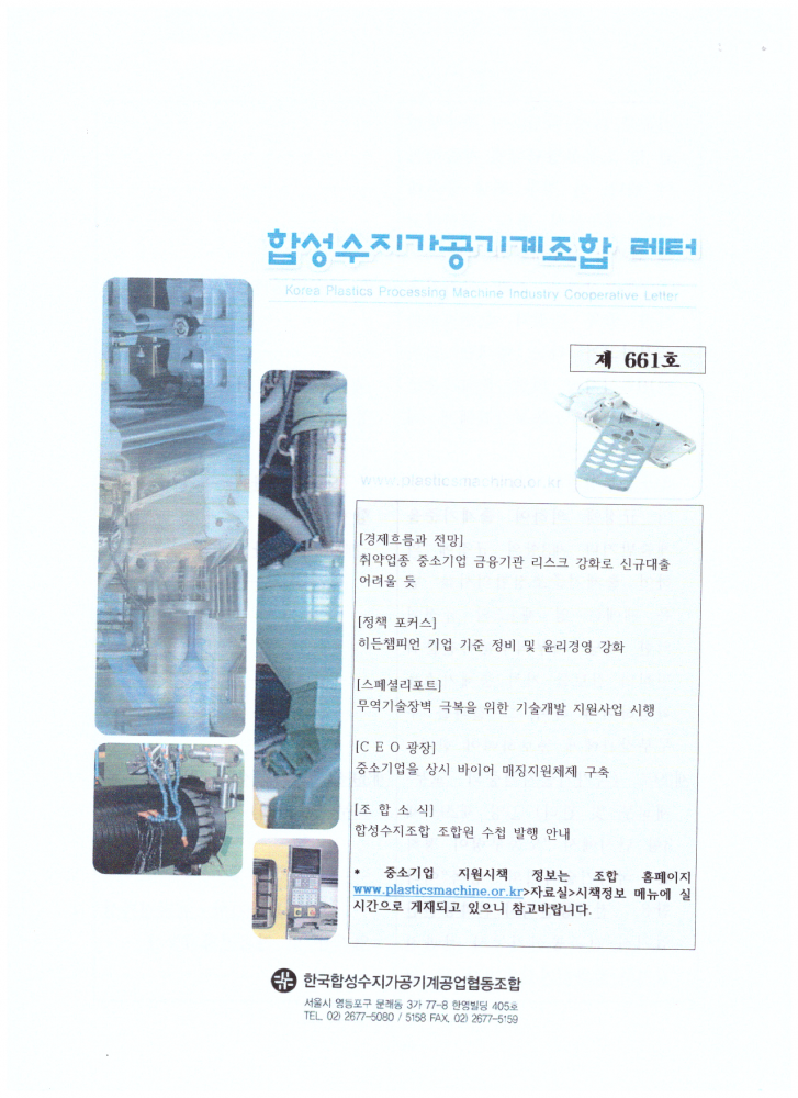 [경제흐름과 전망] 취약업종 중소기업 금융기관 리스크 강화로 신규대출 어려울 듯 [정책 포커스] 히든챔피언 기업 기준 정비 및 윤리경영 강화 [스페셜리포트] 무역기술장벽 극복을 위한 기술개발 지원사업 시행 [C E O 광장] 중소기업을 상시 바이어 매징지원체제 구축 [조 합 소 식] 합성수지조합 조합원 수첩 발행 안내