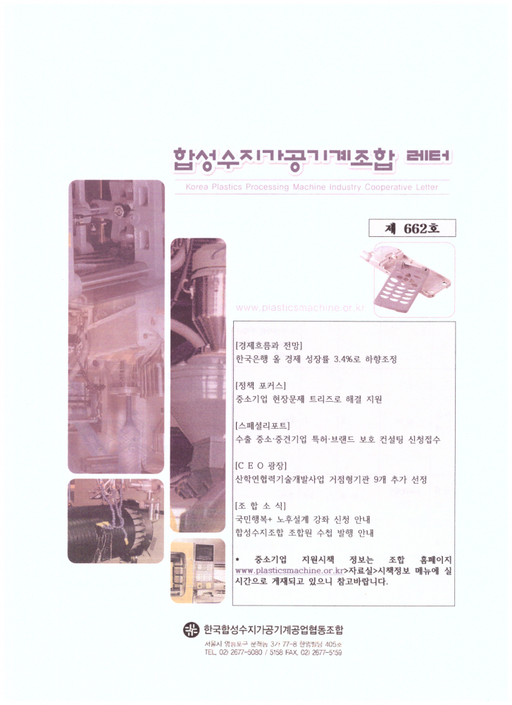 [경제흐름과 전망] 취약업종 중소기업 금융기관 리스크 강화로 신규대출 어려울 듯 [정책 포커스] 히든챔피언 기업 기준 정비 및 윤리경영 강화 [스페셜리포트] 무역기술장벽 극복을 위한 기술개발 지원사업 시행 [C E O 광장] 중소기업을 상시 바이어 매징지원체제 구축 [조 합 소 식] 합성수지조합 조합원 수첩 발행 안내