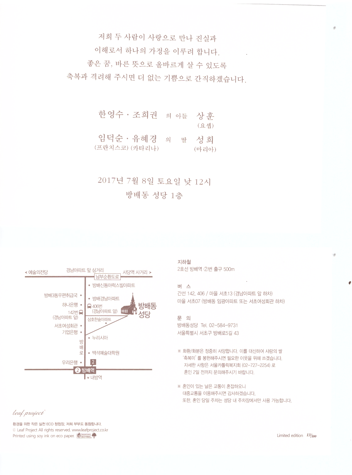 본 조합 이사장이신 (주)한영넉스 한영수 대표님의 아드님 상훈군 결혼식이 있어 안내드립니다. 장소 : 서울 서초구 방배로5길 43 방배동성당 1층 일시 : 2017년 7월 8일 토요일 낮 12시