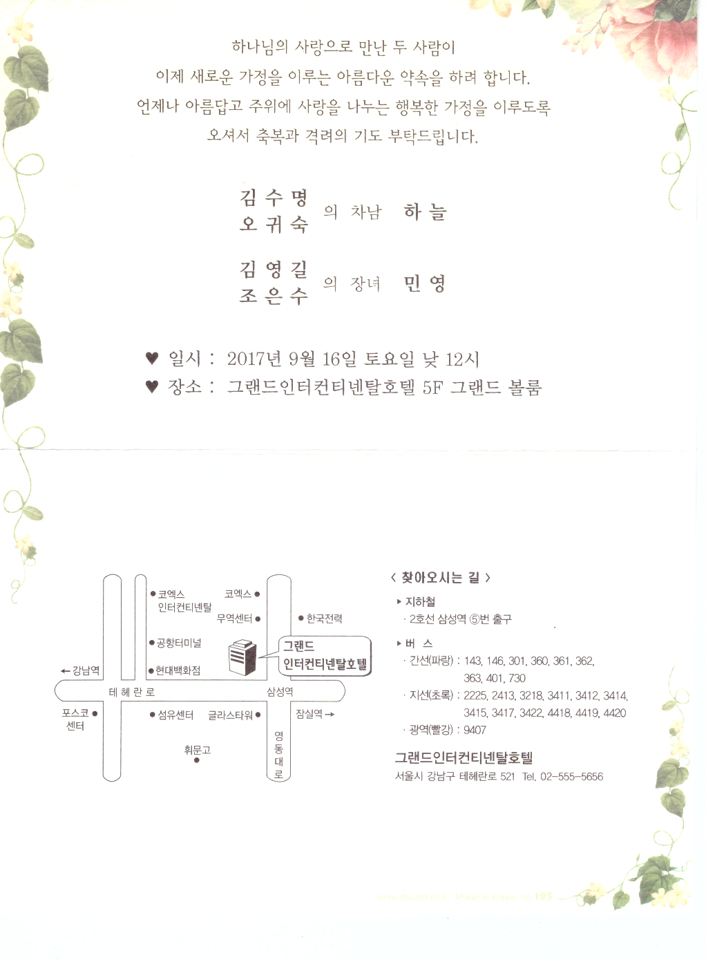 본 조합 압출분과 회원이신 (주)에스엠플라텍 김영길 대표님의 장녀 민영양의 결혼을 아래와 같이 안내드립니다. 장소 : 그랜드인터콘티넨탈호텔 5층 그랜드볼룸 일시 : 2017년 9월 16일 토요일 낮 12시