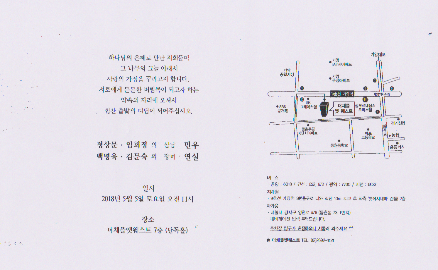 본 조합 주변기기 회원이신 대성산기 정민우 대표님의 결혼을 아래와 같이 안내드립니다. 장소 : 더채플앳웨스트 7층 (단독홀) 서울시 강서구 양천로 476 일시 : 2018년 5월 5일 토요일 오전 11시