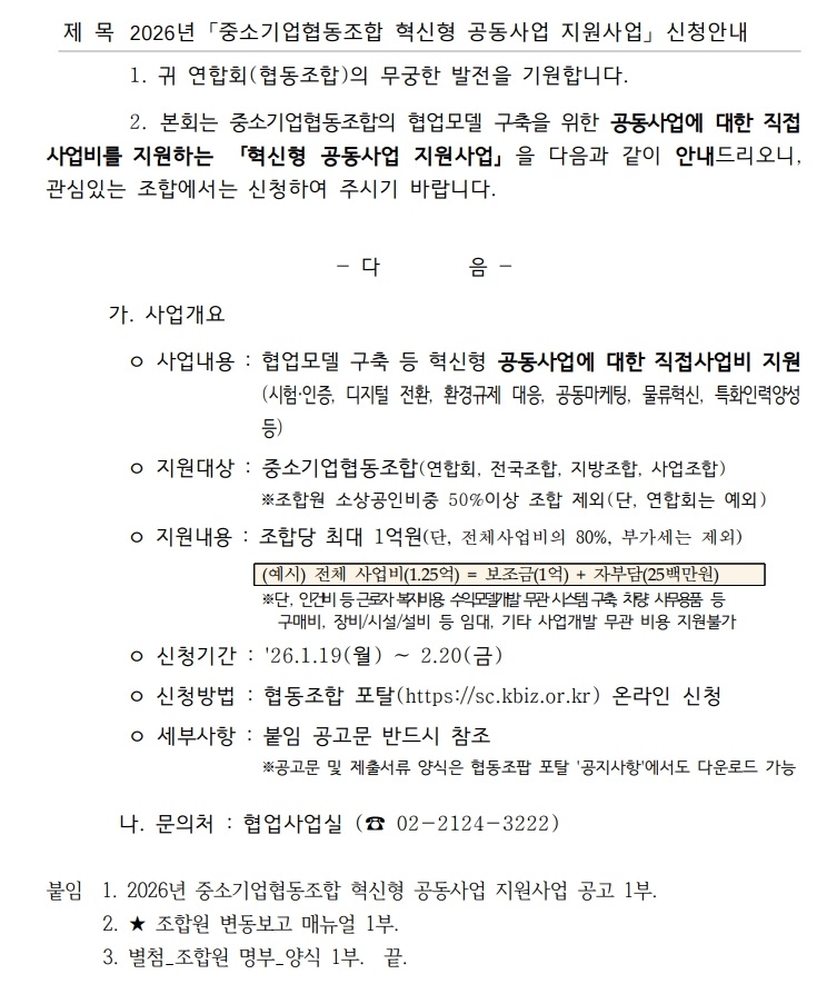 2026년 「중소기업협동조합 혁신형 공동사업 지원사업」 신청안내.jpg 2026년 중소기업협동조합 혁신형 공동사업 지원사업 공고.hwp ★ 조합원 변동보고 매뉴얼.hwp | |