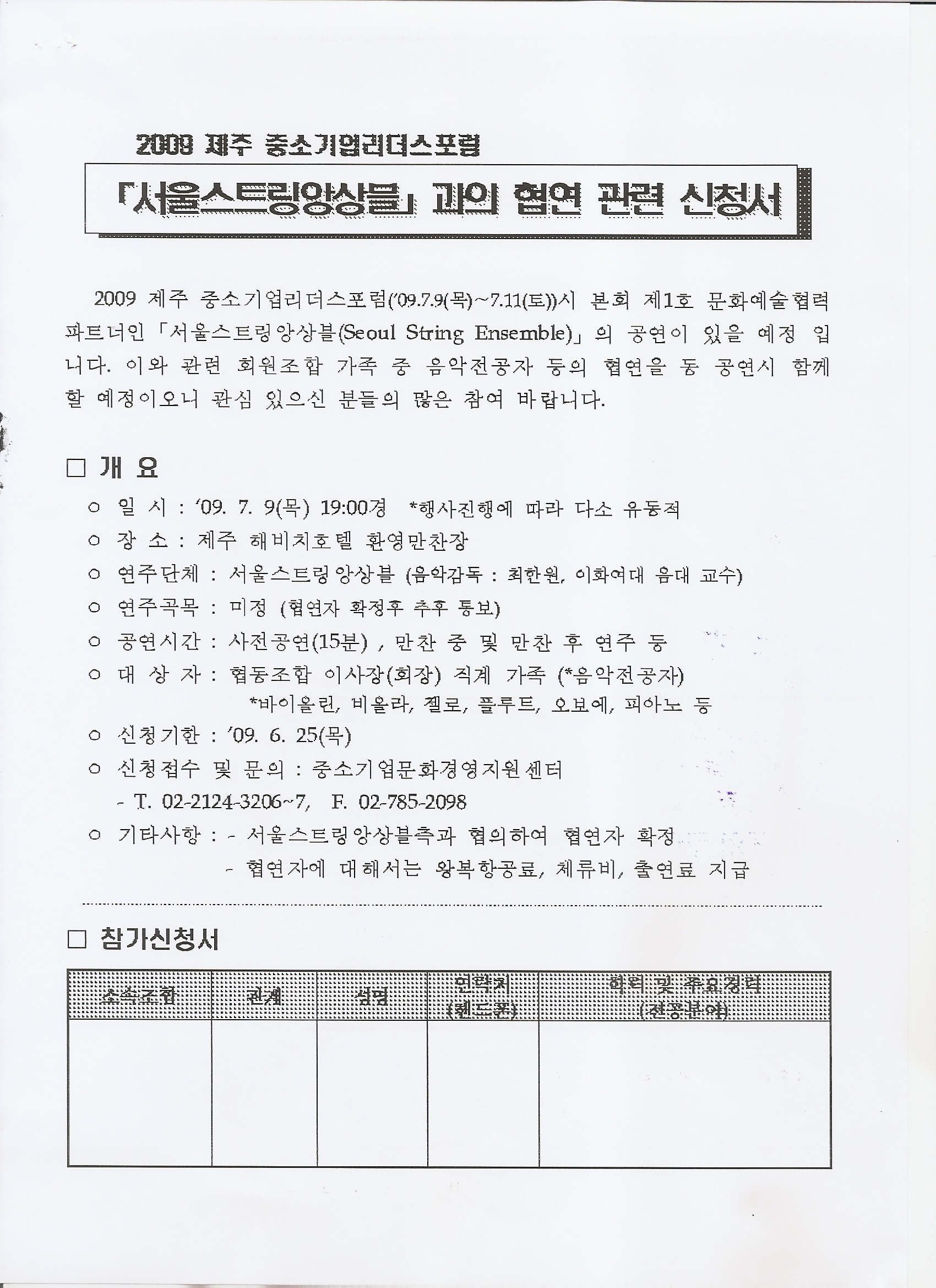 2. | 2009 제주 중소기업리더시포럼(7월 9일 - 11일까지)시 중소기업중앙회 제1호 문화예술협력 |