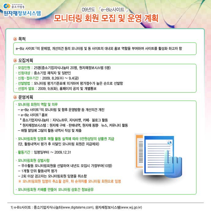 2. 중소기업청 원자재정보시스템에서는 e-Biz 사이트의 문제점 개선의견 등의 모니터링 및 동 사이트의 대내외 홍보 역할을 부여하여 사이트를 활성화 하고자 모니터링 회원을 모집코자 한다고 합니다.