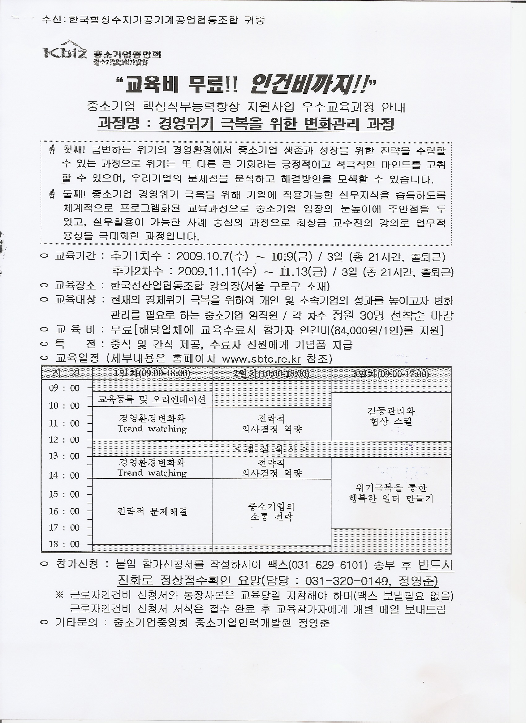 3. 아울러, 중소기업 경영위기 극복을 위해 기업에 적용 가능한 실무지식을 습득하도록 체계적으로 프로그램화된 교육과정으로 중소기업 입장의 눈높이에 주안점을 두었다고 하고, 실무활용이 가능한 사례 중심의 과정으로 최상급 교수진의 강의 로 업무적용 성을 극대화한 과정이라고 합니다.