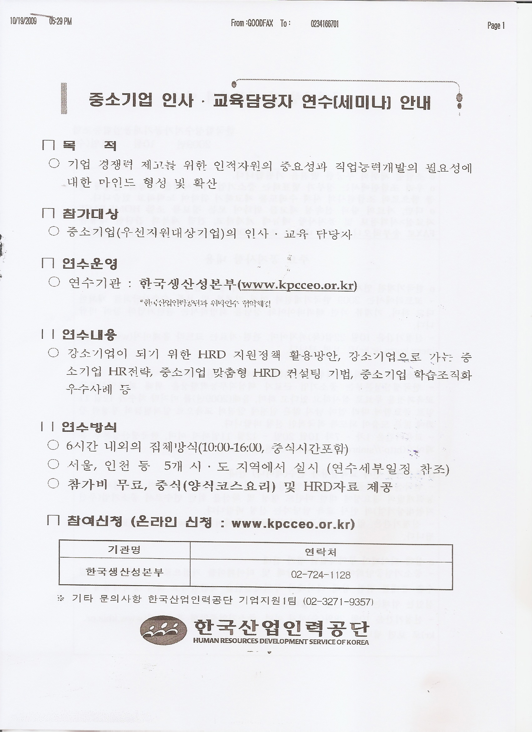 한국산업인력공단에서는 기업 경쟁력 제고를 위한 인적자원의 중요성과 직업능력개발의 필요성에 대한 마인드 형성 및 확산을 위한 연수로서 중소기업(우선지원대상기업)의 인사 교육 담당자는 신청 바랍니다.