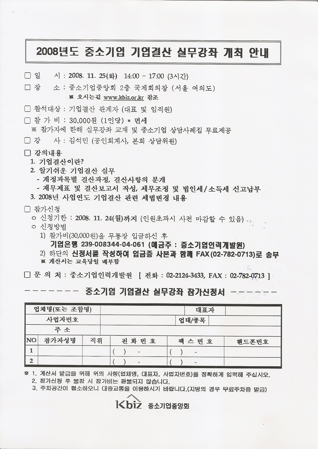 중소기업 기업결산 실무강좌 안내