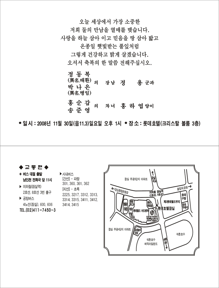 정 용 군과 홍하엽 양이 11월 30일(일) 오후1시에 롯데호텔(크리스탈 볼룸