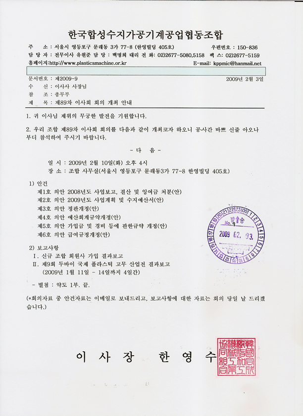 우리 조합 제89차 이사회 회의를 다음과 같이 개최코자 하오니 공사간 바쁘 신줄 아오나 부디 참석하여 주시기 바랍니다.