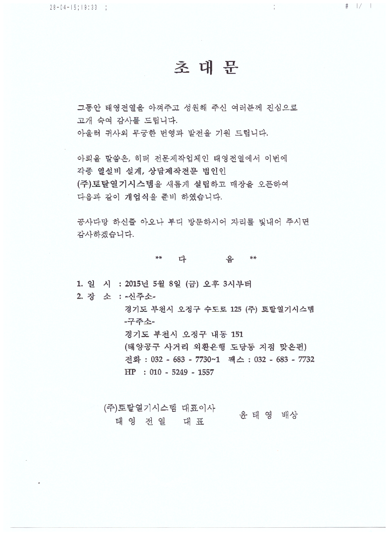 태영전열[(주)토탈열기시스템] 개업식 안내 | |