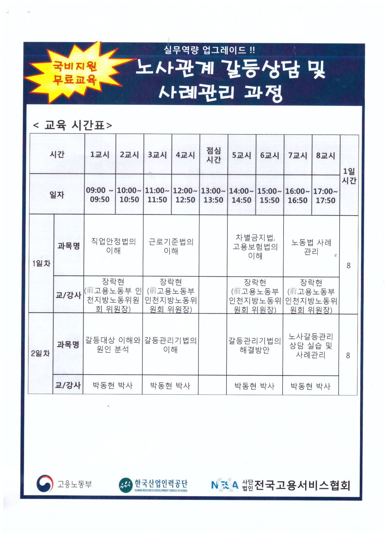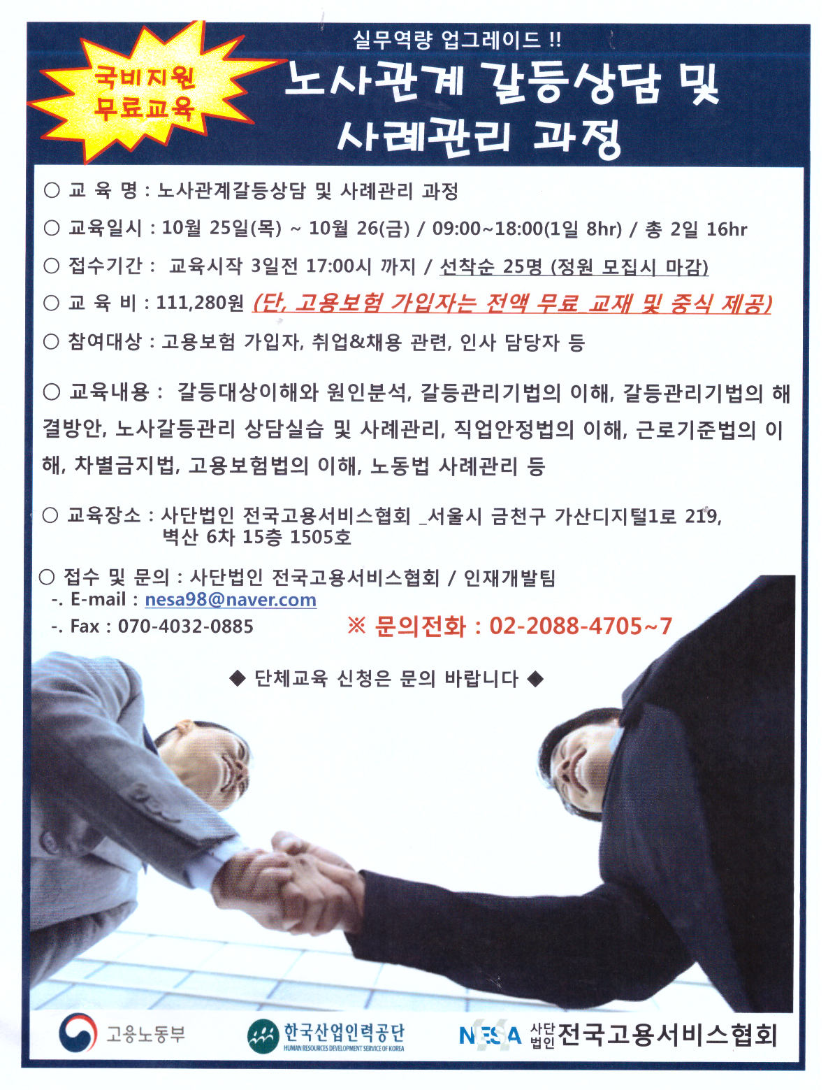 교육명 : 노사관계상담및 사례관리과정 교육일시 : 10월 25일 목요일~ 10월 26일 금요일 접수기간 : 교육시작 3일전 17시까지 자세한 사항은 첨부파일 참고 부탁드립니다.