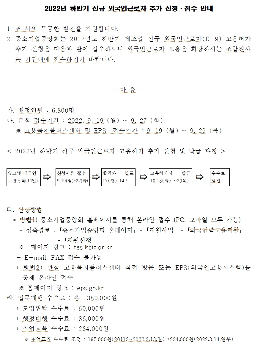 2022년 하반기 신규 외국인근로자 추가 신청·접수 안내