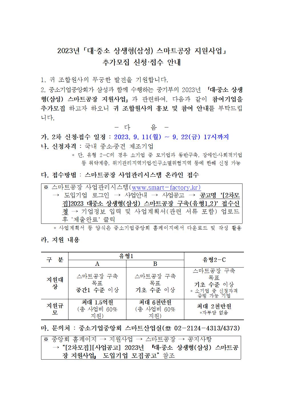 2023년 「대·중소 상생형(삼성) 스마트공장 지원사업」 추가모집 신청·접수 안내